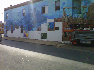 Then he started to paste the 5 foot x 5 foot canvas panels onto the brick wall one by one......These are the panels the community helped paint too!!
